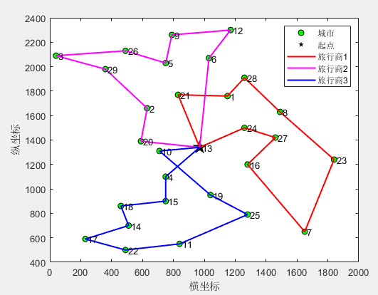 第1个旅行商的路径:13->24->27->16->7->23->8->28->1->21->13