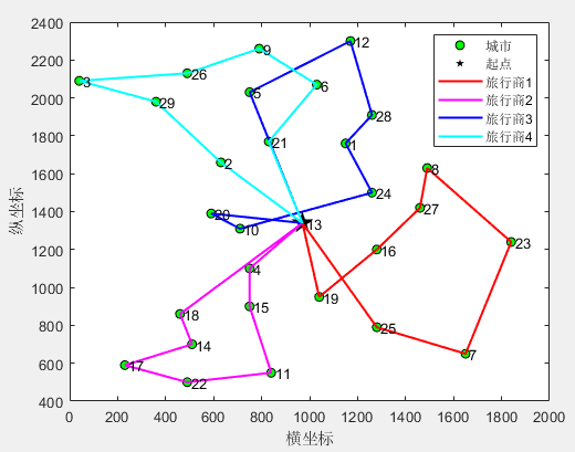 第4个旅行商的路径:13->2->29->3->26->9->6->21->13