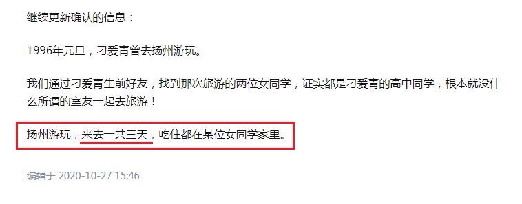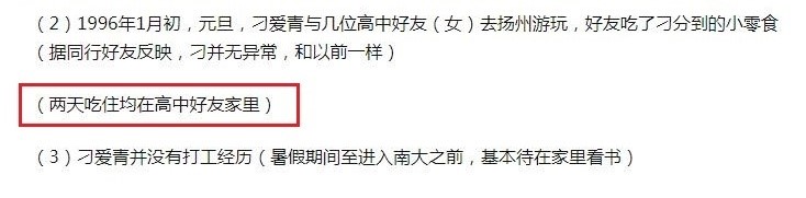 这就说明了:1996年12月30日刁爱青与高中同学出发去扬州,当天30日与第二天31日,这两天吃住都在高中同学家里;第三天,也就是96年的元旦回到南京大学,共计三天两夜在扬州游玩。