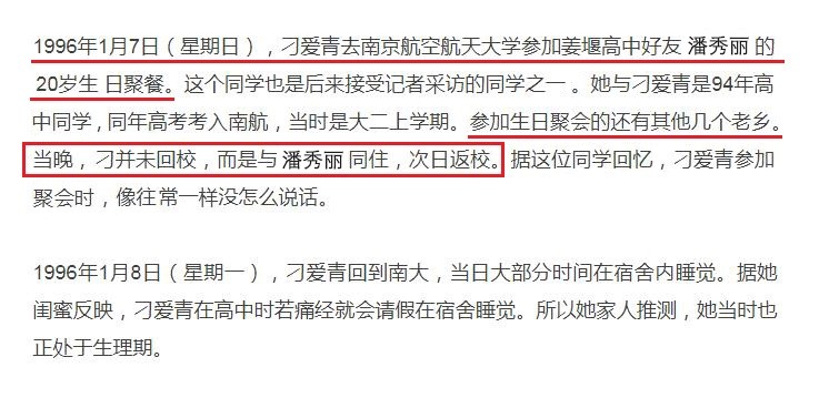 于1996年1月8日(星期一),返回到南大,当日大部分时间在宿舍内睡觉。据刁家人推测:刁爱青当时正处在生理期。