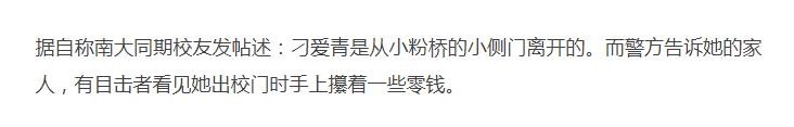 1996年1月10日(星期三)傍晚,据一个自称南大同期校友发帖描述:刁爱青是从小粉桥的小侧门离开的。而警方告诉她的家人,有目击者看见她出校门时手上攥着一些零钱。