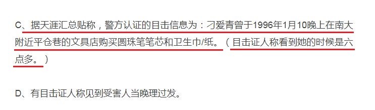 据天涯汇总贴称,警方认证的目击信息为:刁爱青曾于1996年1月10晚上在南大附近平仓巷的文具店购买圆珠笔笔芯和卫生巾/纸。(目击证人称看到她的时候是六点多。)