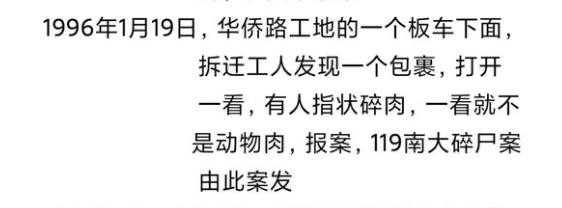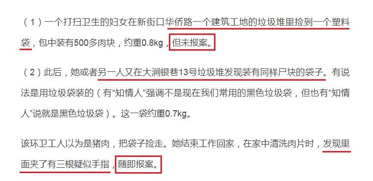 也有不少网友说是:华侨路确实是最早发现的尸块,但没报案;是环卫工人在大锏银巷13号的垃圾堆里发现了一包肉块,带回家洗净后发现了3根手指,是最早报的案。