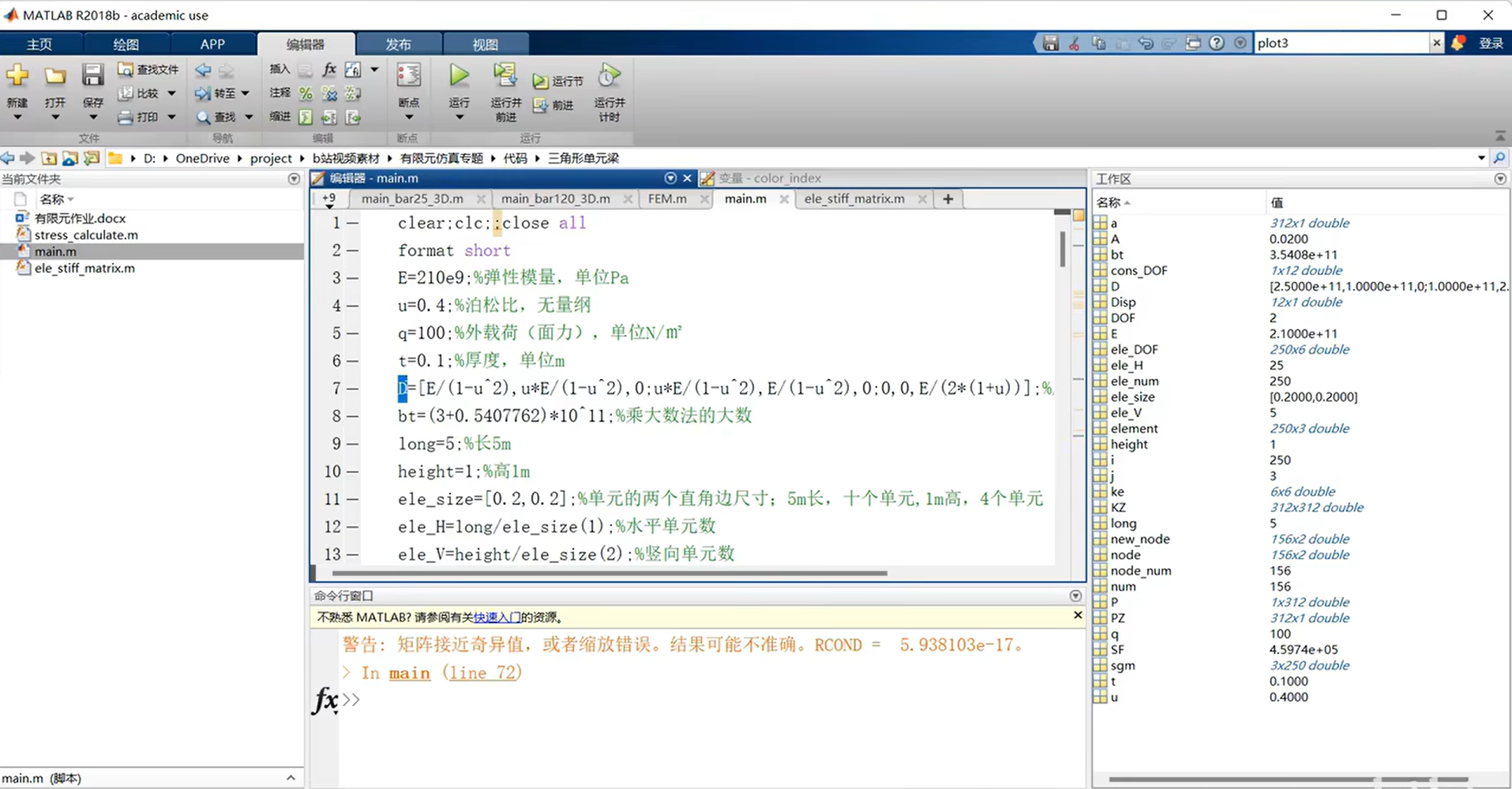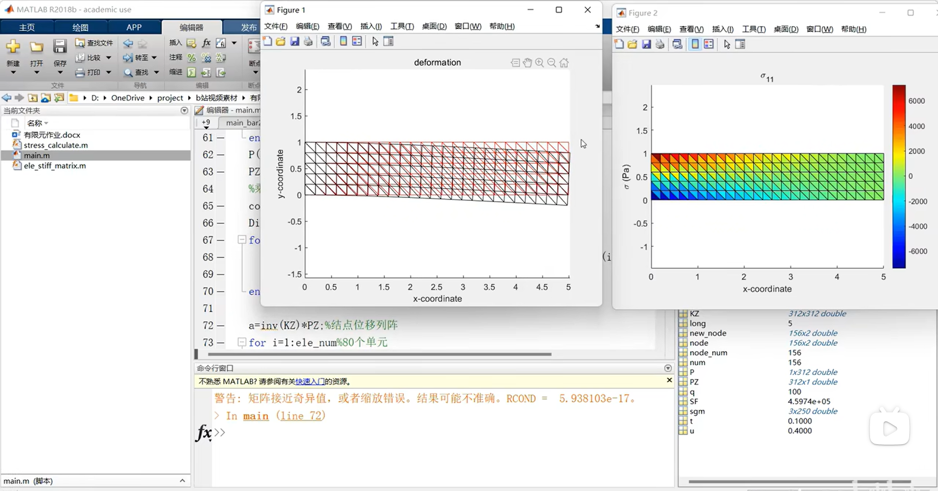 本代码利用Matlab实现三节点三角形单元悬臂梁结构的有限元编程求解,涉及的有限元知识点主要是三角形单元刚度矩阵推导+乘大数法施加边界条件等有限元理论。为了辅助理解代码背后的有限元理论,配套提供对应的桁架结构Matlab有限元编程视频教程和讲义PPT,详细讲解了上述有限元理论。视频教程链接见文末。