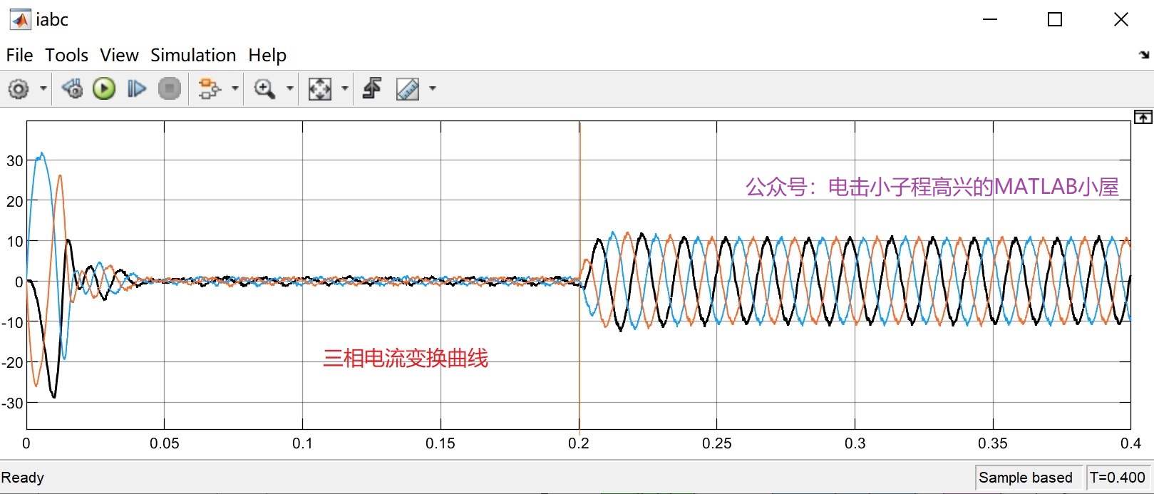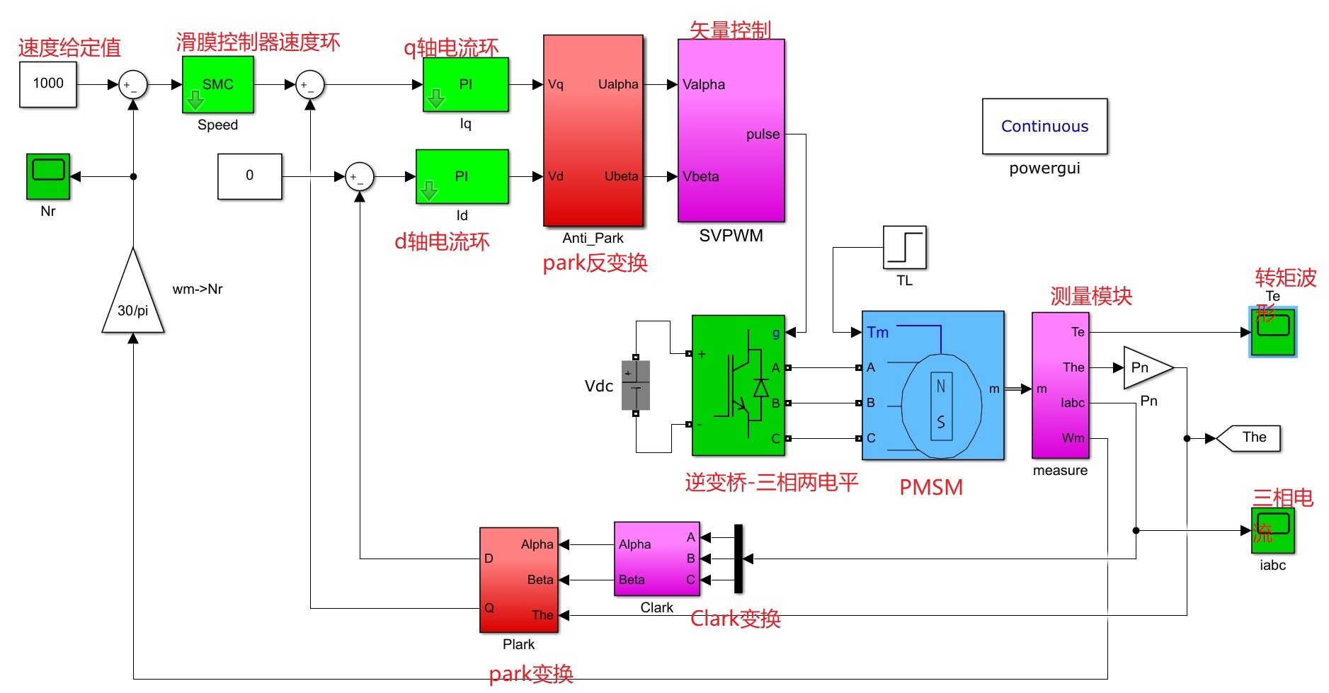 (1)仿真模型由直流源、三相逆变桥、永磁同步电机(PMSM)、转速外环滑膜控制器、电流内环PI控制器、Park变换模块、Clark变换模块、测量模块等构成.