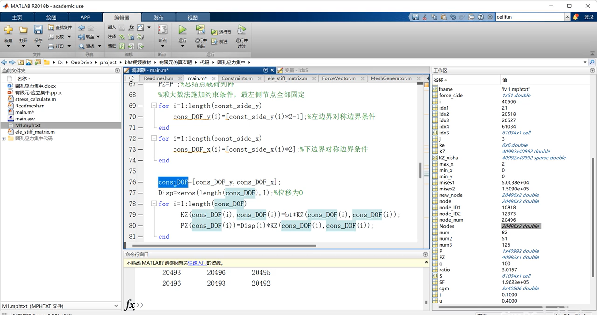 本程序利用Matlab实现带圆孔平板应力集中问题的的有限元编程求解,平板采用的单元为三角形单元,网格信息来自Comsol中分网后生成的.mph文件,因此代码涉及comsol.mph网格文件的读取接口的开发,另外由于单元节点数较大,为了提高计算和存储效率,采用了稀疏矩阵的方式定义单元刚度矩阵,涉及的有限元知识点主要是三角形单元刚度矩阵推导、乘大数法施加边界条件、稀疏矩阵的应用等有限元理论。为了辅助理解代码背后的有限元理论,配套提供带圆孔平板应力集中问题Matlab有限元编程视频教程和PPT讲义,详细讲解了上述有限元理论。视频教程链接见文末。