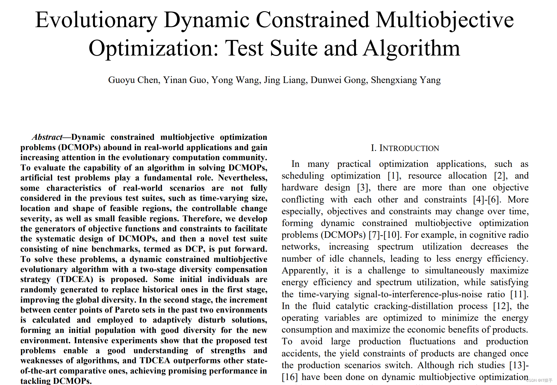 [1]G. Chen, Y. Guo, Y. Wang, J. Liang, D. Gong and S. Yang, “Evolutionary Dynamic Constrained Multiobjective Optimization: Test Suite and Algorithm,” in IEEE Transactions on Evolutionary Computation, doi: 10.1109/TEVC.2023.3313689.