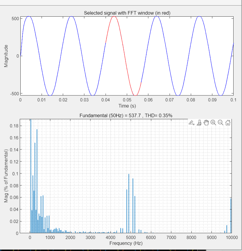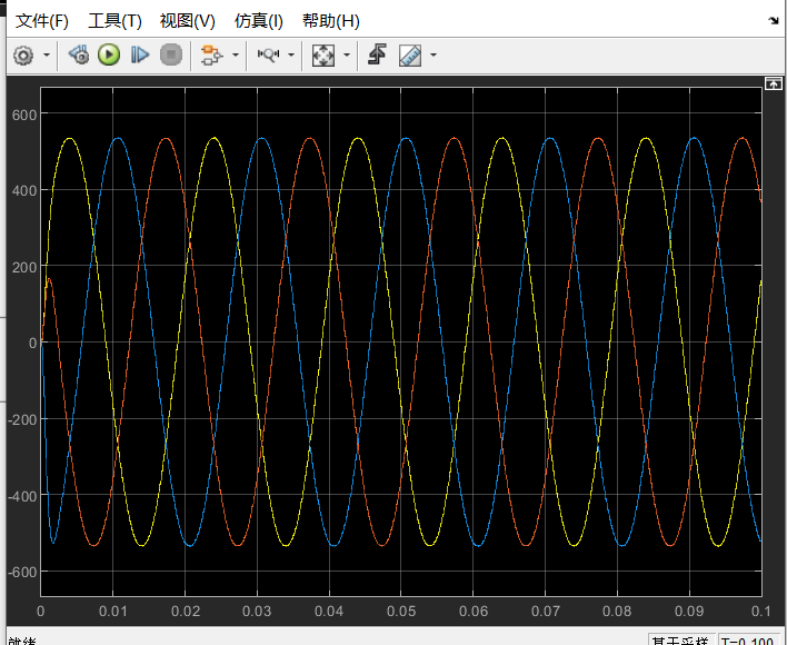本设计使用simulink实现三相两电平逆变器的SVPWM控制策略,其运行完美,FFT分析时拥有较小的谐波:基波537.7,THD仅为0.35%。