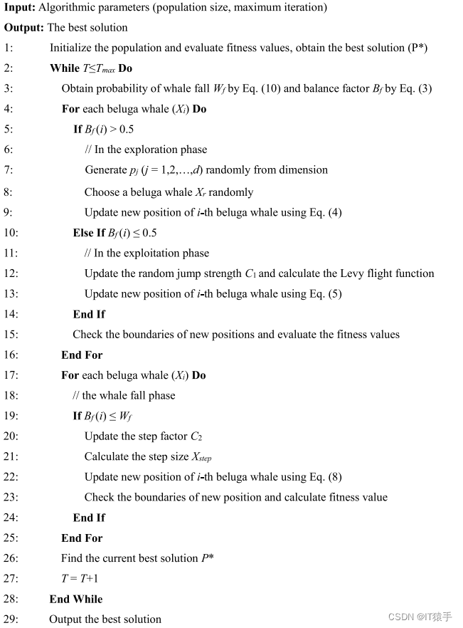 白鲸优化算法(Beluga whale optimization,BWO)由Changting Zhong等人于2022年提出,该算法模拟了白鲸游泳,觅食和“鲸鱼坠落”行为。白鲸优化算法( Beluga Whale Optimization,BWO)