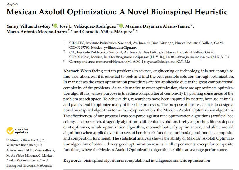 [1]Villuendas-Rey, Yenny, José Luis Velázquez-Rodríguez, Mariana Dayanara Alanis-Tamez, Marco Moreno-Ibarra and Cornelio Yáñez-Márquez. “Mexican Axolotl Optimization: A Novel Bioinspired Heuristic.” Mathematics 9 (2021): 781.