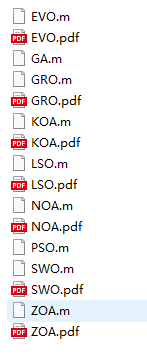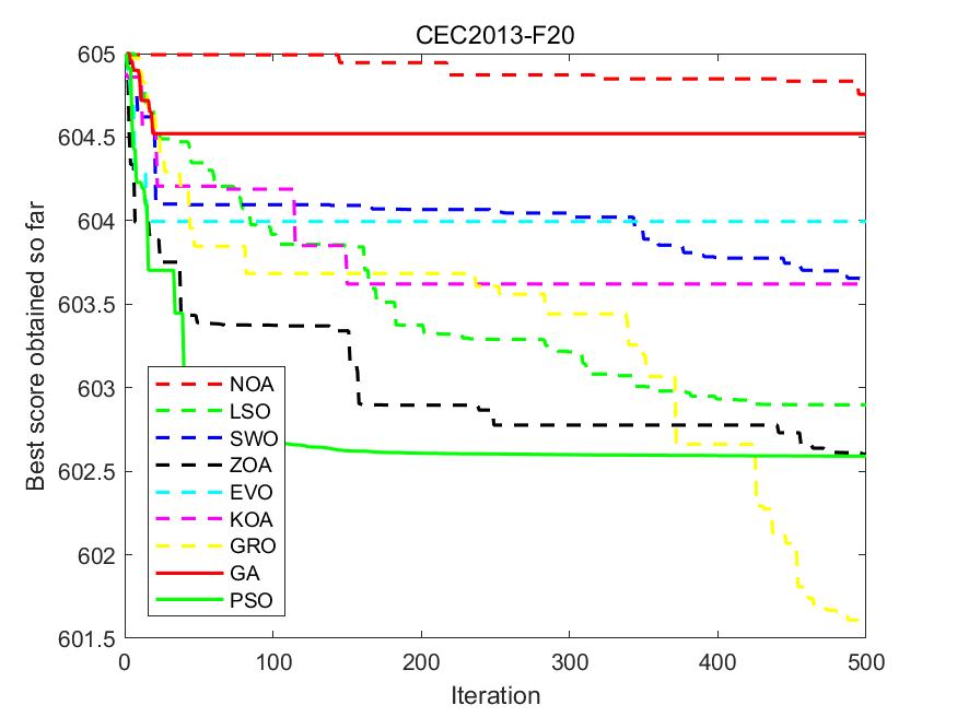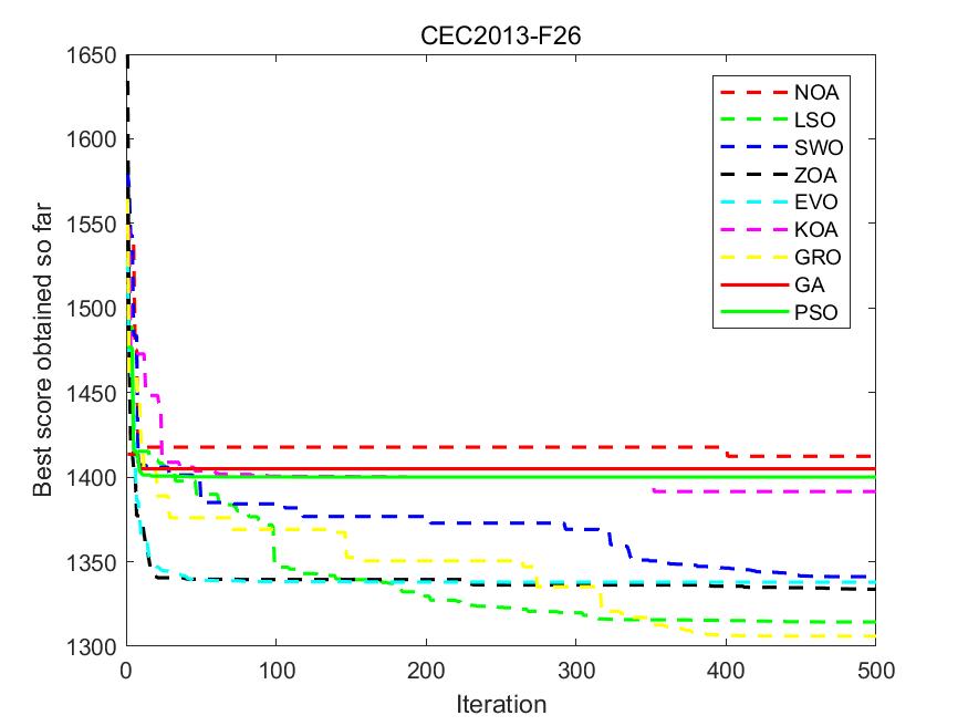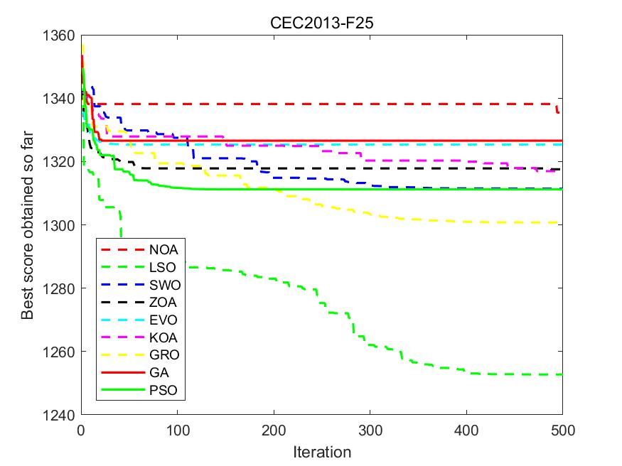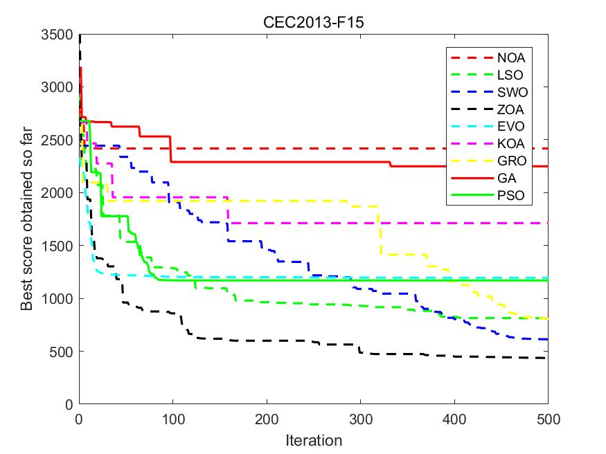 AlgorithmName={'NOA','LSO','SWO','ZOA','EVO','KOA','GRO','GA','PSO'};%算法名称
