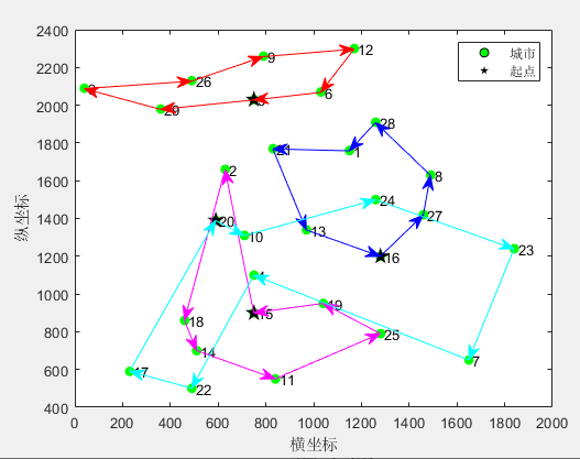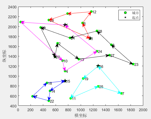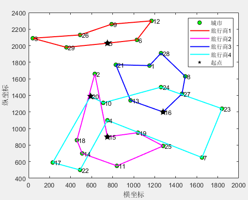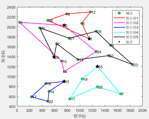 StartPoint=[1 5 15 16 20];%起点城市的序号(可以修改) 必须由小到大排列 (建议:2到6个旅行商)