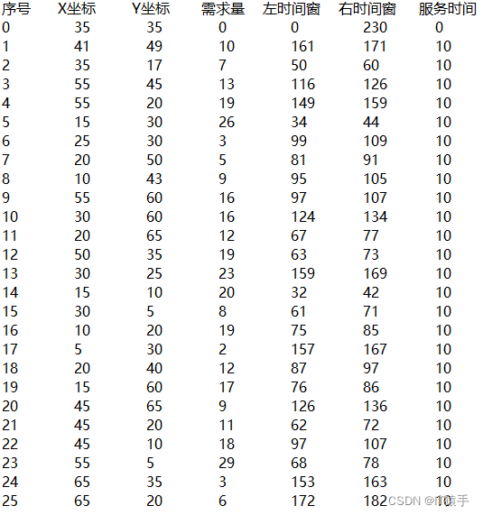 本文选取数据集的详细信息如下表所示,其包含1个配送中心(序号0表示配送中心),25个顾客(序号1-25),且每个车辆载重量限制为200。(可以更换为其他数据集)