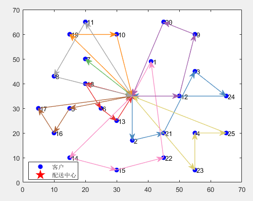 配送路线5:0->23->4->25->0 服务顾客数量:3 路径长度:94.59653 装载量:54