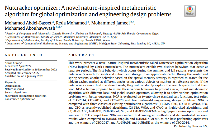 [1]Mohamed Abdel-Basset, Reda Mohamed, Mohammed Jameel, Mohamed Abouhawwash.Nutcracker optimizer: A novel nature-inspired metaheuristic algorithm for global optimization and engineering design problems[J]. Knowledge-Based Systems,2023,262.