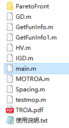 文件夹内包含MOTROA求解46个多目标测试函数(ZDT1、ZDT2、ZDT3、ZDT4、ZDT6、DTLZ1-DTLZ7、WFG1-WFG10、UF1-UF10、CF1-CF10、Kursawe、Poloni、Viennet2、Viennet3)以及1个工程应用(盘式制动器设计)的全部MATLAB代码,同时提供评价指标IGD、GD、HV和SP的完整程序,点击Main.m即可运行。提供使用说明。