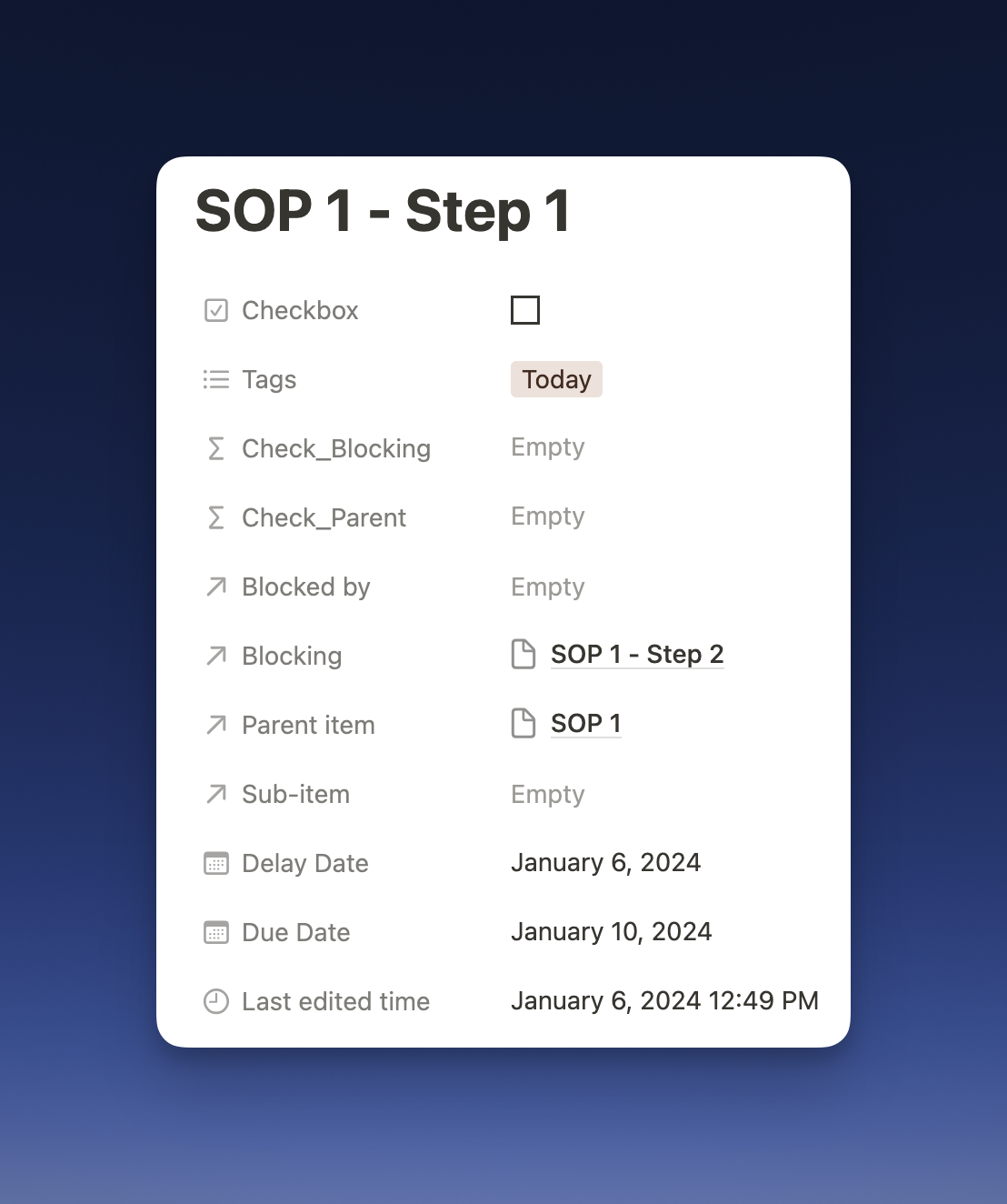首先,创建一个具有子项和依赖关系的Notion数据库。前者是为了区分SOP和任务,后者是为了为不同任务分配顺序。