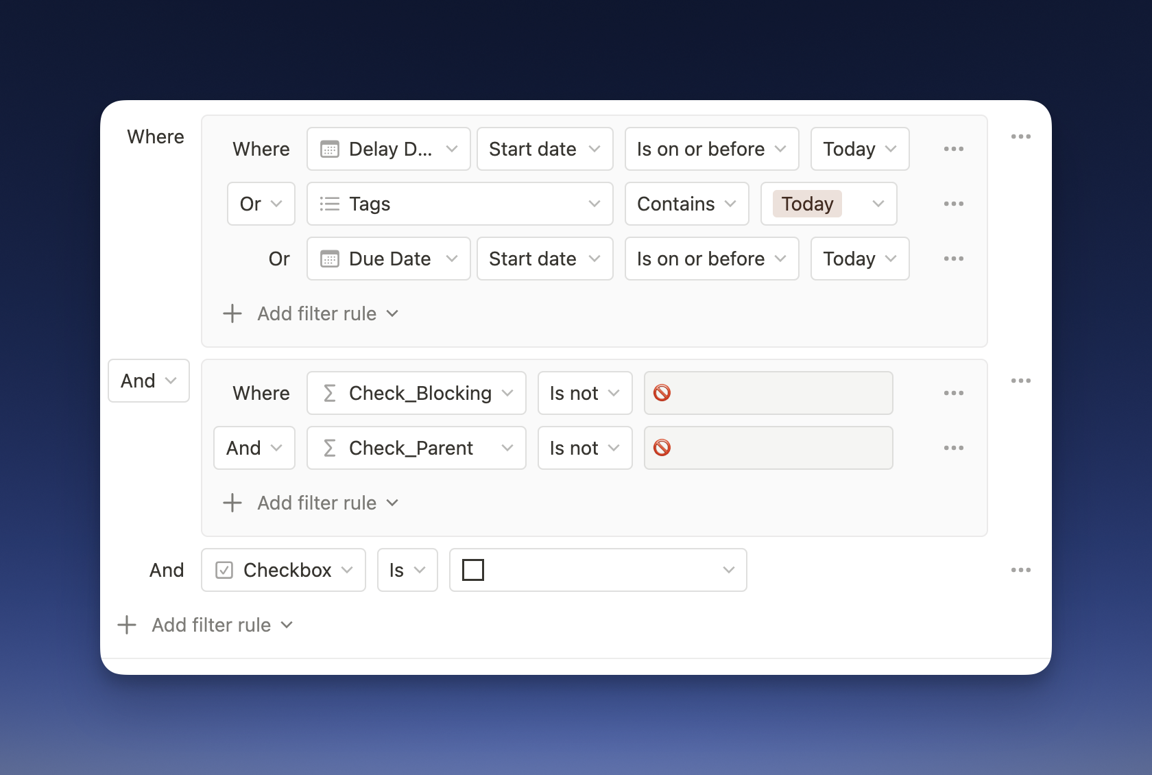 第三,创建两个属性来找出不同项目的所有子任务的完成状态以及前置任务的完成状态。缺少这两个属性,我们是没办法复制OmniFocus 4到Notion里的。前者是帮助你专注于需要立即行动的任务,另一个是提醒你该项目下所有任务已完成,因为在Notion中还不能实现自动勾选,所以我换了个折衷方案。