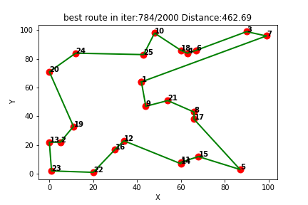 Q-learning得到的最短路线: [1, 9, 21, 8, 17, 5, 15, 11, 14, 12, 16, 22, 23, 13, 2, 19, 20, 24, 25, 10, 18, 4, 6, 3, 7, 1]