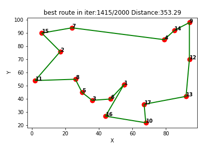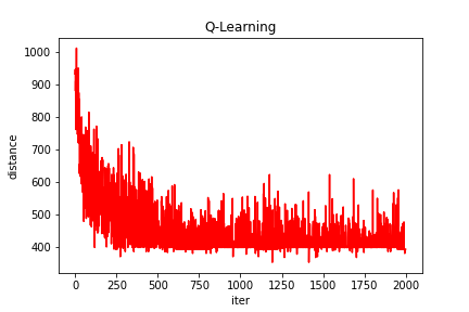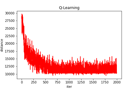 Q-learning得到的最短路线: [1, 6, 3, 5, 8, 11, 2, 15, 7, 4, 14, 9, 12, 13, 17, 10, 16, 1]