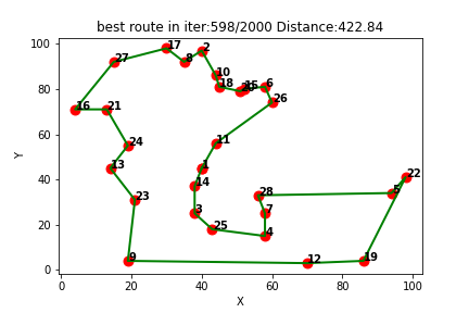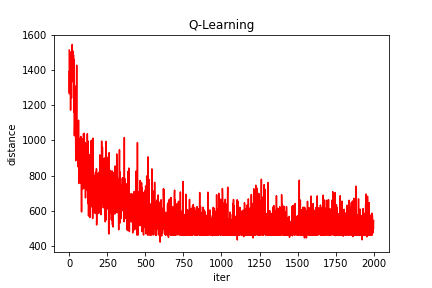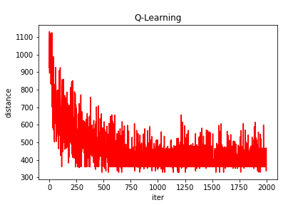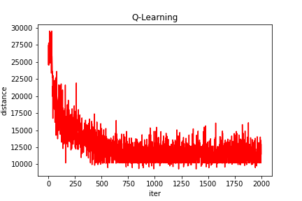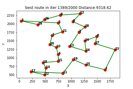 Q-learning得到的最短路线: [1, 28, 6, 12, 9, 26, 29, 3, 5, 21, 2, 20, 10, 4, 15, 18, 14, 22, 17, 11, 19, 25, 7, 23, 27, 8, 24, 16, 13, 1]