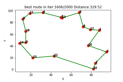 Q-learning得到的最短路线: [1, 17, 6, 9, 13, 7, 4, 11, 8, 18, 3, 14, 15, 12, 10, 2, 5, 16, 1]