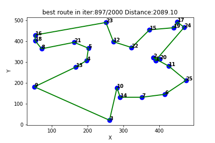 Q-learning得到的最短路线: [1, 20, 2, 11, 25, 6, 7, 14, 10, 3, 9, 13, 4, 5, 21, 8, 18, 16, 23, 12, 22, 15, 19, 17, 24, 1]