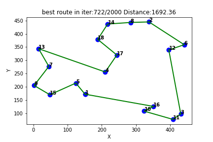 Q-learning得到的最短路线: [1, 16, 10, 11, 3, 12, 6, 2, 8, 14, 18, 17, 4, 13, 7, 9, 15, 5, 1]