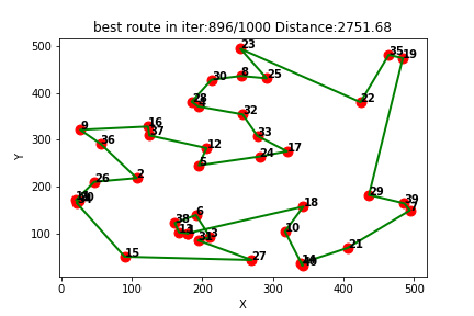 Q-learning得到的最短路线: [1, 13, 38, 6, 3, 31, 27, 15, 34, 20, 11, 26, 2, 36, 9, 16, 37, 12, 5, 24, 17, 33, 32, 4, 28, 30, 8, 25, 23, 22, 35, 19, 29, 39, 7, 21, 14, 40, 10, 18, 1]