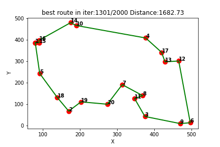 Q-learning得到的最短路线: [1, 15, 16, 14, 10, 4, 17, 13, 12, 6, 9, 3, 11, 8, 7, 20, 19, 2, 18, 5, 1]