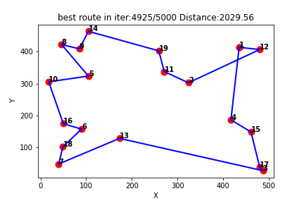 Q-learning得到的最短路线: [1, 12, 2, 11, 19, 14, 9, 8, 5, 10, 16, 6, 18, 7, 13, 3, 17, 15, 4, 1]