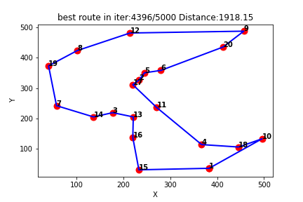 最短路线: [1, 15, 16, 13, 3, 14, 7, 19, 8, 12, 9, 20, 6, 5, 2, 17, 11, 4, 18, 10, 1]
