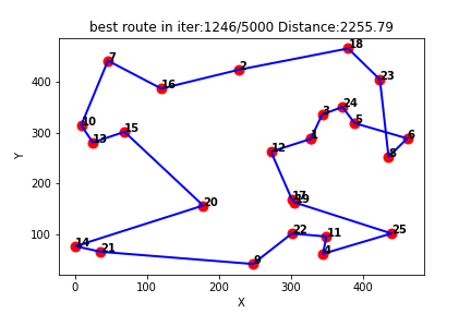 Q-learning得到的最短路线: [1, 3, 24, 5, 6, 8, 23, 18, 2, 16, 7, 10, 13, 15, 20, 14, 21, 9, 22, 11, 4, 25, 19, 17, 12, 1]