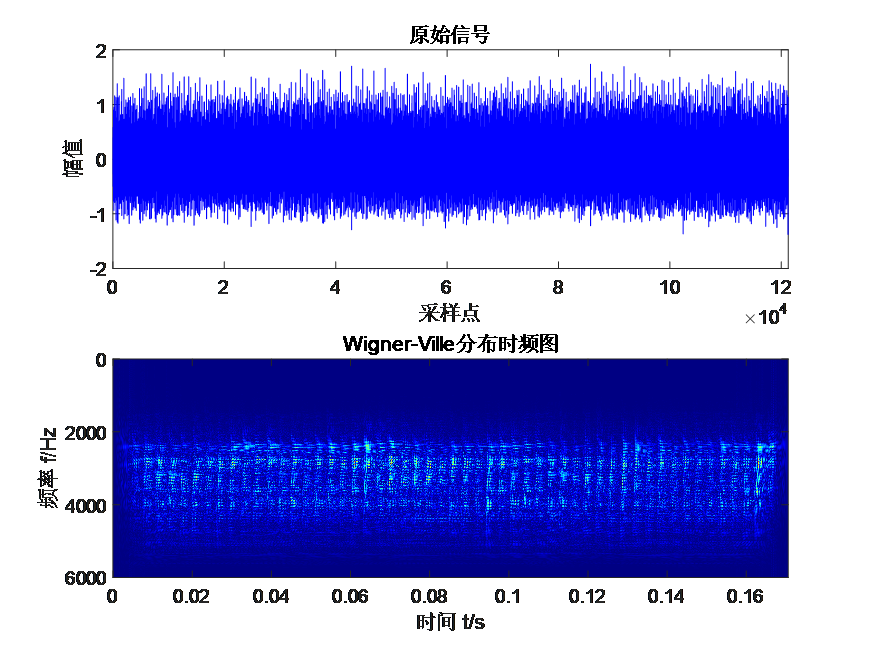 Wigner-Ville 分布: Wigner-Ville 分布是一种联合时频分析方法,通过计算信号的瞬时自相关函数,得到信号在时频域上的信息。由于Wigner-Ville 分布不含任何窗函数,因此就避免了在线性时频分析方法中其时间分辨率以及频率分辨率不能兼顾的矛盾。Wigner-Ville 分布的时频分辨率很高,也有很好的时频聚集性,比较适合分析非平稳的信号,但是其缺点是时频面存在很严重的交叉项干扰问题,影响了时频分析的结果。