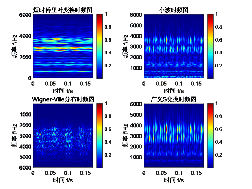 - 广义 S 变换:时频谱上可以看出,广义 S 变换采用的高斯窗函数依据信号的频率不同,做出相应的窗口的改变,并且修正了小波变换的相位问题,因此在时频谱上相比,其时间分辨率和频率分辨率都有明显的改善。