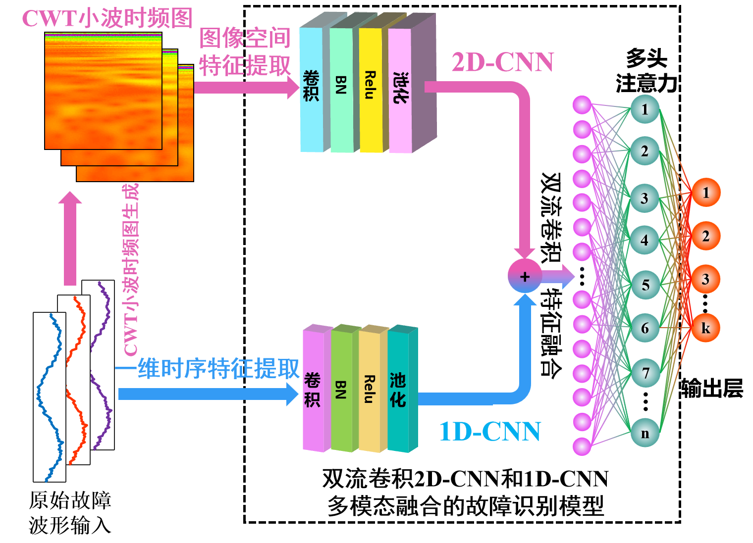 模型改进:我们提出的模型在上述模型基础上作出多重改进:采用双支路结构,仅需原始故障波形数据,即可根据波形数据,将一维序列转化为二维小波cwt时频图像。①一路为图像输入经2D-CNN提取小波时频图像特征,②另一路为故障波形直接输入1D-CNN提取时序特征,高维图像特征和一维时序特征融合,构建出1D-CNN和2D-CNN(双流卷积)模型。③融合多头注意力机制有效把握提取特征的贡献程度,将特征进行重点强化,提高故障识别的准确率,并计算精确度、召回率、精确率、F1分数等评价指标。故障识别流程如下: