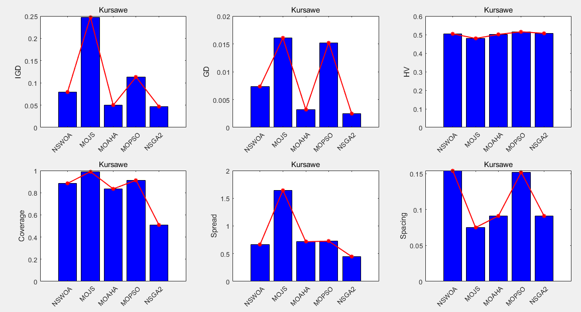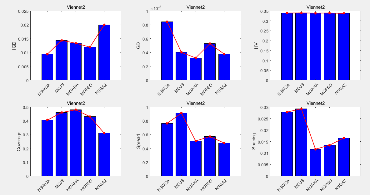 为了测试5种算法的性能将其求解9个多目标测试函数(zdt1、zdt2 、zdt3、 zdt4、 zdt6 、Schaffer、 Kursawe 、Viennet2、 Viennet3),其中Viennet2 与Viennet3的目标为3,其余测试函数的目标为2,并采用6种评价指标(IGD、GD、HV、Coverage、Spread、Spacing)进行评价对比