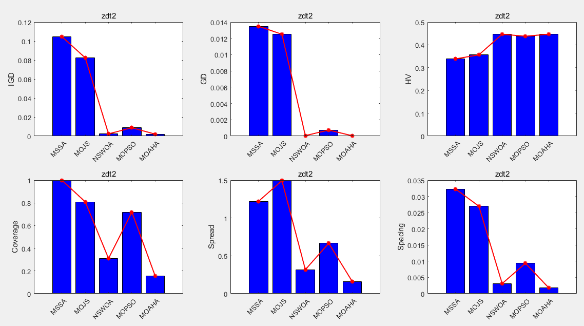 为了测试5种算法的性能将其求解9个多目标测试函数(zdt1、zdt2 、zdt3、 zdt4、 zdt6 、Schaffer、 Kursawe 、Viennet2、 Viennet3),其中Viennet2 与Viennet3的目标数为3,其余测试函数的目标数为2,并采用6种评价指标(IGD、GD、HV、Coverage、Spread、Spacing)进行评价对比