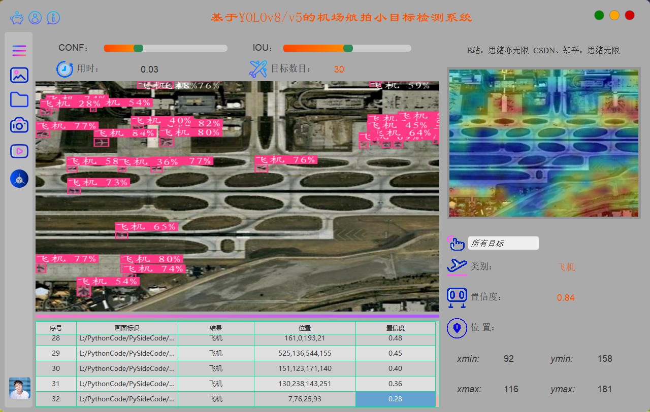 此代码资源包为本人在 CSDN 、知乎、博客园等平台上分享的博文:基于YOLOv8/YOLOv7/YOLOv6/YOLOv5的机场航拍小目标检测系统(Python+PySide6界面+训练代码)中分享的完整代码和资源整合。包含训练数据集、训练代码、UI界面代码、深度学习模型等完整代码。