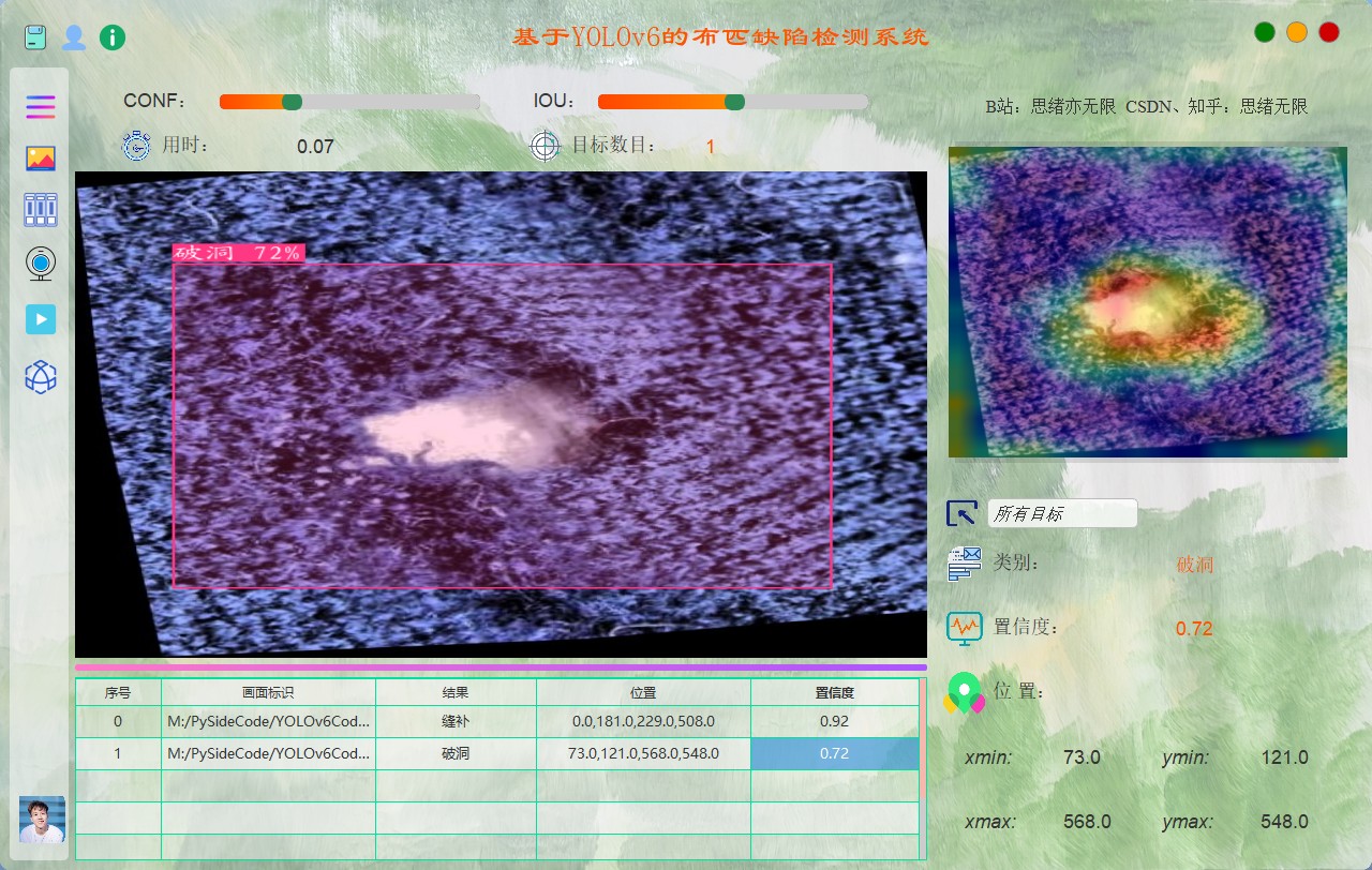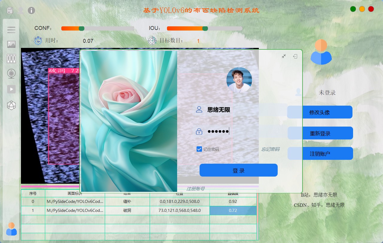 功能:基于深度学习的布匹缺陷检测系统的完整代码,并展示了采用领先的YOLOv6算法的实现代码。该系统可以从静态图像到实时视频流的各种媒介中检测布匹缺陷的高效性和准确性。提供了对应的Python代码实践、必要的训练数据集,以及一个基于PySide6的交互式用户界面。系统特点包括图像、视频、摄像头中布匹缺陷的精确识别与分类、一个基于SQLite的用户登录注册管理系统、模型快速切换机制以及可自定义的UI界面。