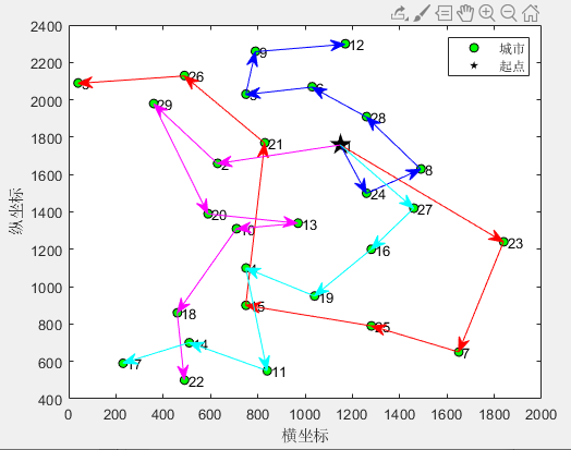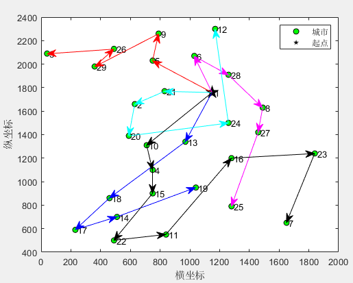 第2个旅行商的路径:1->2->29->20->13->10->18->22