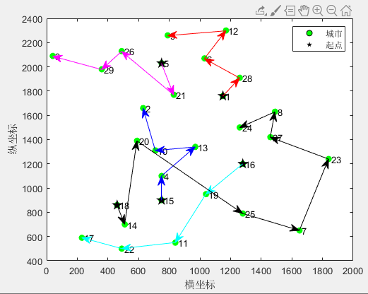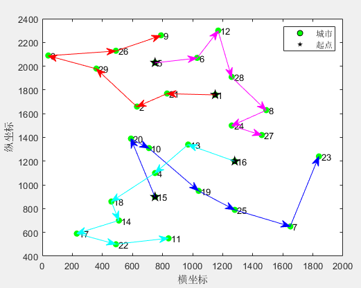 StartPoint=[1 5 15 16 18];%起点城市的序号(可以修改) 必须由小到大排列 (建议:2到6个旅行商)