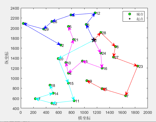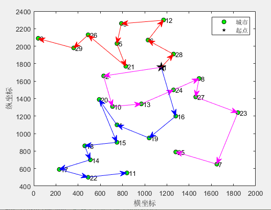 第1个旅行商的路径:1->28->6->12->9->5->21->26->29->3