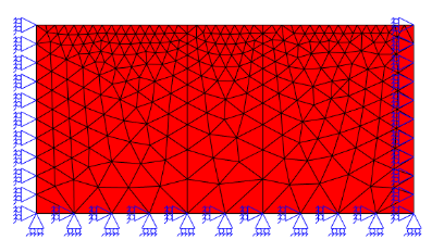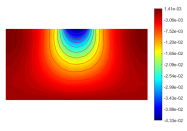 案例为对象进行材料非线性问题的有限元变成求解,求解模型如图1,模型边界为20m×10m,公式1-3材料本构方程如公式1所示,其中,弹性模量E=20MPa,泊松比0.35,模型上表面中间位置作用20kPa超载,超载作用范围为4m。按照平面应变问题考虑,使用常应变三角形单元分析模型上表面中间点竖向沉降,对应的有限元模型和计算结果如图2、3所示。