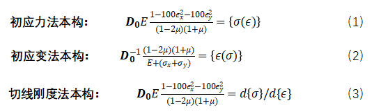 之所以采用公式1-3三种不同的应力应变关系本构方程,是因为牛顿-拉普森法(切线刚度法)、初应力法、初应变法适用于不同形式的本构方程:切线刚度法,顾名思义,其刚度表达式为应力应变曲线的切线,因此采用微分形式表示其本构关系;初应力法适用于应力由应变确定的本构形式,即应力为应变量,应变为自变量;但某些问题中,应力无法用应变显式表达,相反,应变由应力表达的本构形式,这种情况的非线性本构方程采用初应变法来求解。