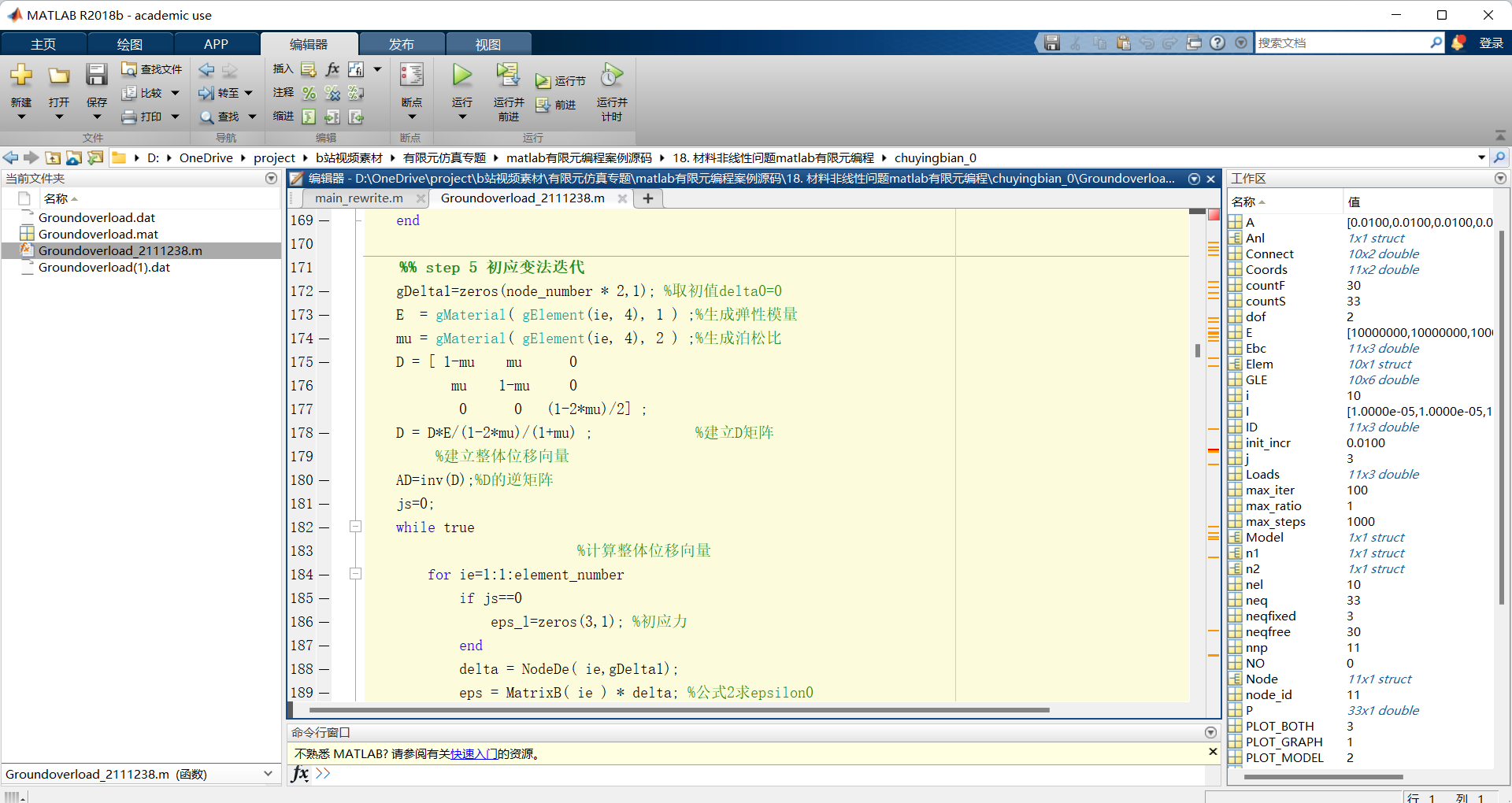 该Matlab程序主要围绕材料非线性问题进行有限元Matlab编程求解,重点围绕牛顿-拉普森法(切线刚度法)、初应力法、初应变法等三种非线性迭代方法的算法的实现。具体非线性迭代求解算法的理论文本可参考知乎博文《材料非线性Matlab有限元编程之初应力法与初应变法》《材料非线性Matlab有限元编程之切线刚度法案例应用》,该博文详细三种迭代迭代求解算法的原理。