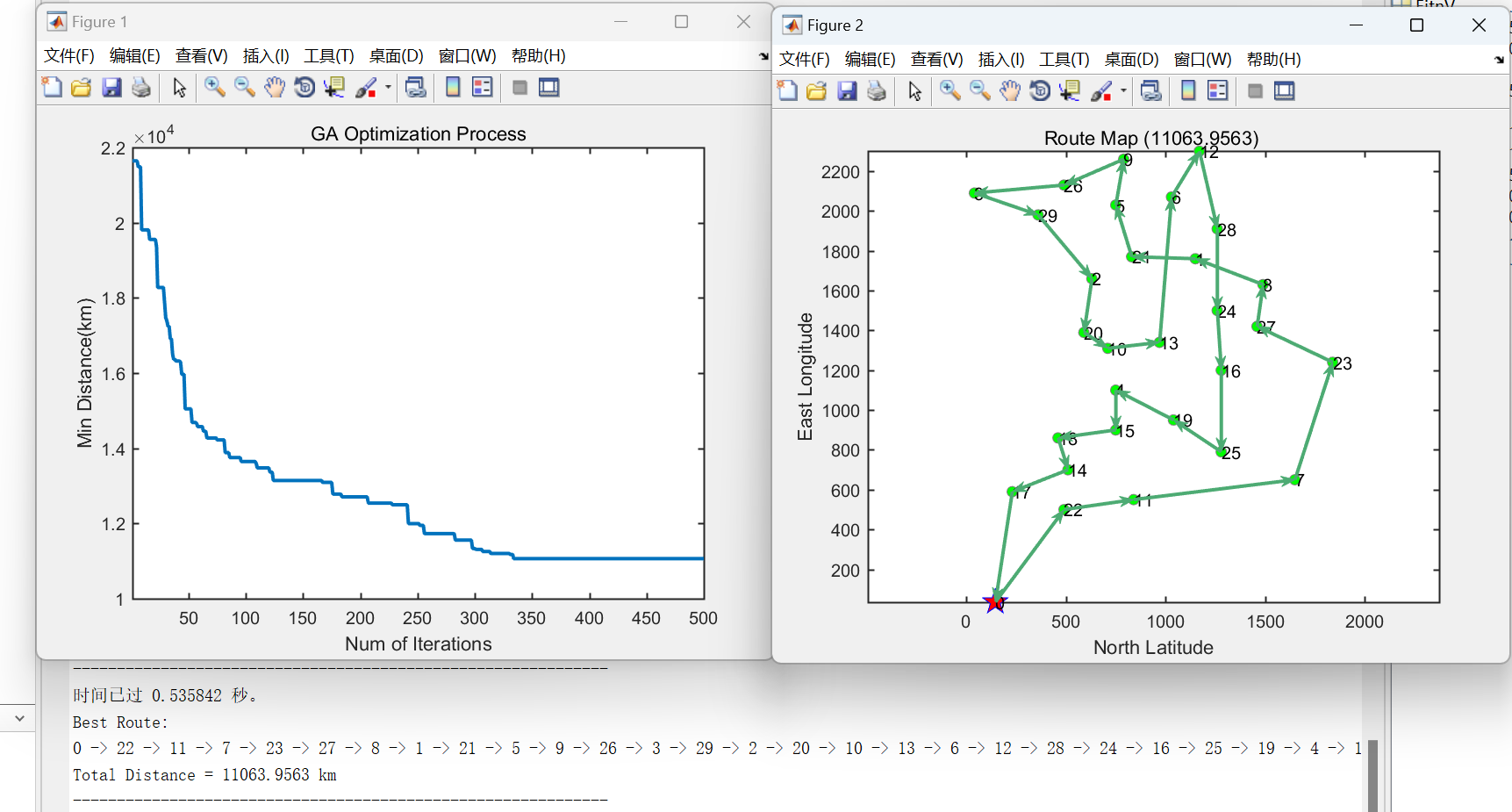 以上截图展示了基于GA进行TSP问题的优化算法在不同地图上的运行效果。可以看到,算法成功地找到了最短路径,且在不同地图上都能快速寻优。这证明了遗传算法在解决TSP问题上具有实用性和有效性。