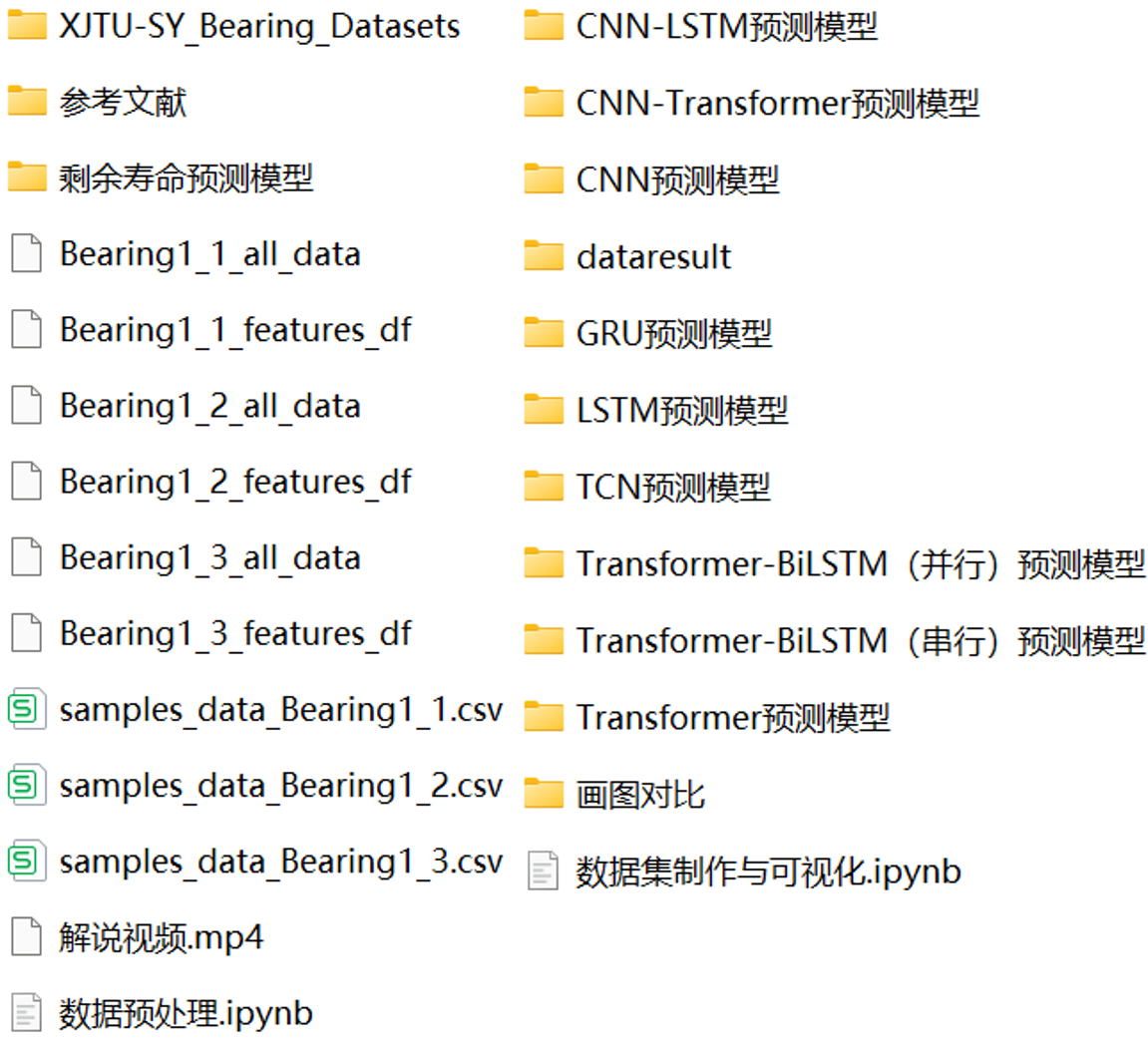 本期我们继续更新轴承寿命预测合集: 新增XJTU-SY 滚动轴承加速寿命试验数据集相关预测模型,提供 LSTM、CNN、GRU、TCN、Transformer、CNN-LSTM、 CNN-Transformer、Transformer-BiLSTM等系列预测模型全家桶: