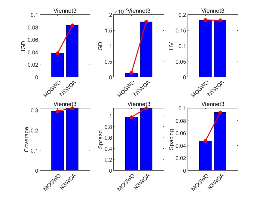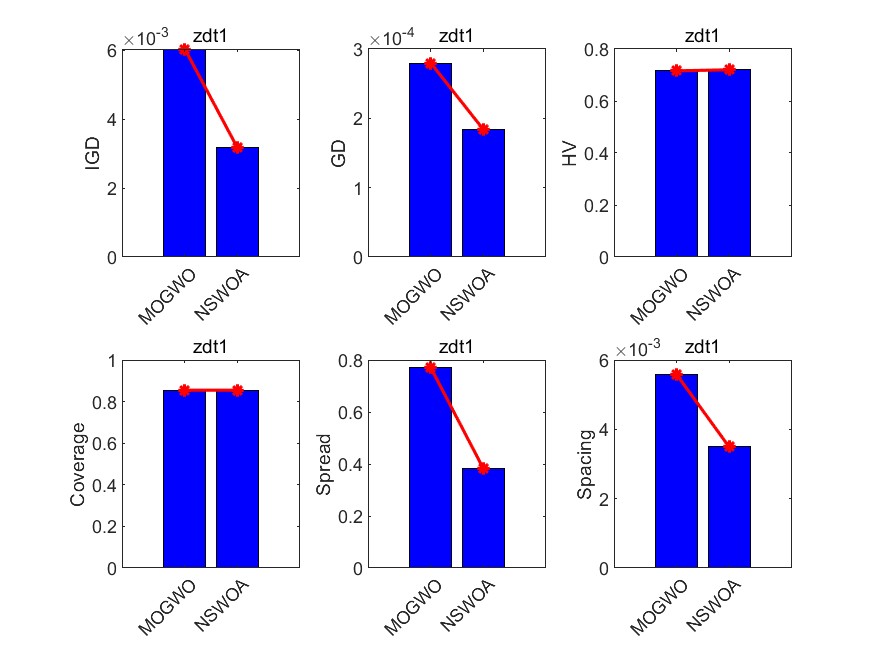多目标灰狼优化算法MOGWO与非支配鲸鱼优化算法NSWOA在9个测试函数(zdt1 zdt2 zdt3 zdt4 zdt6 Schaffer Kursawe Viennet2 Viennet3)上对比包含六种评价指标。