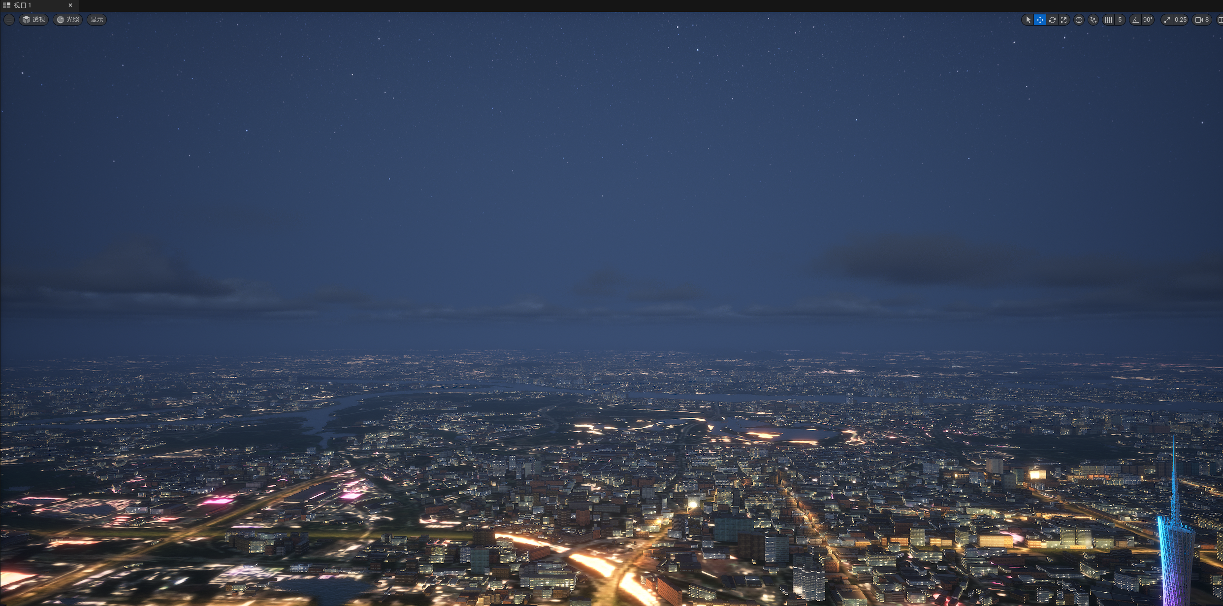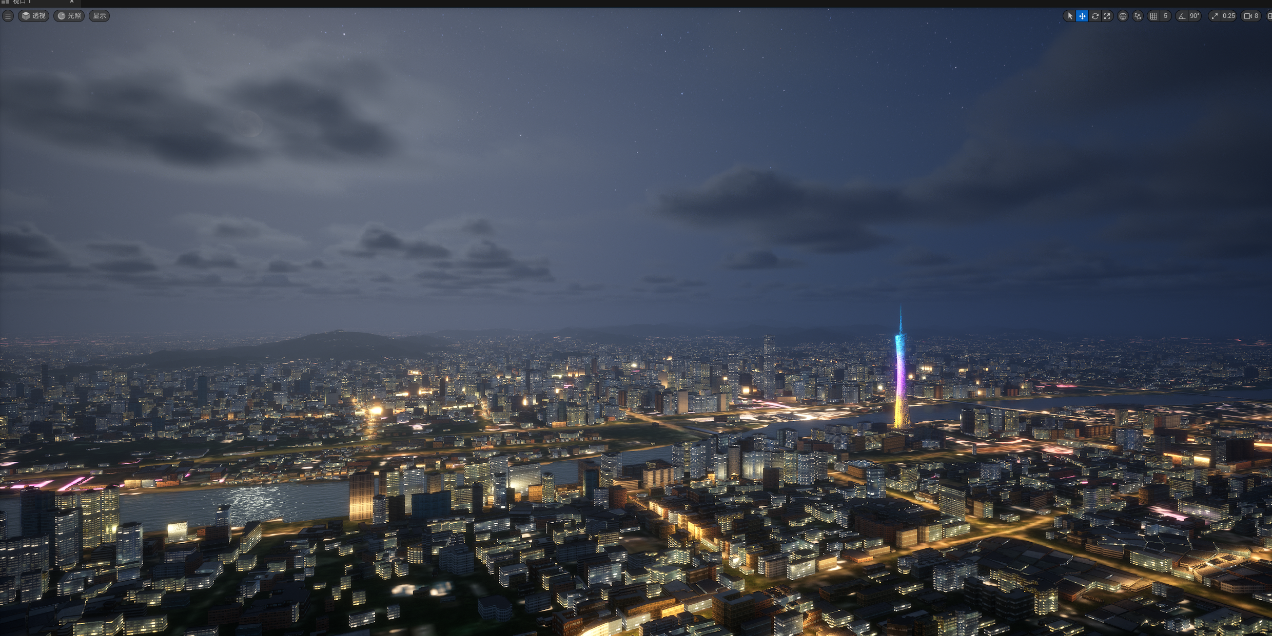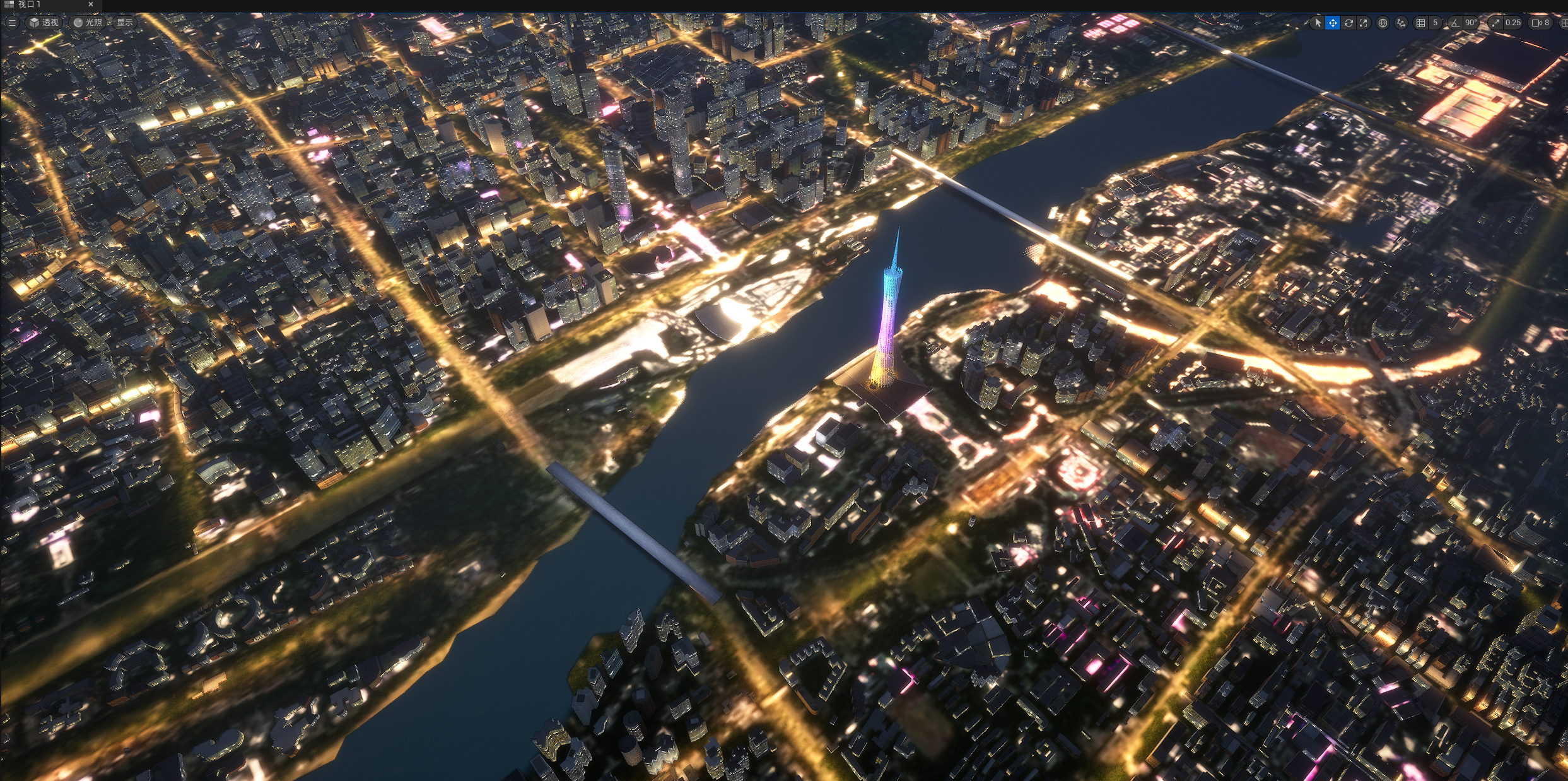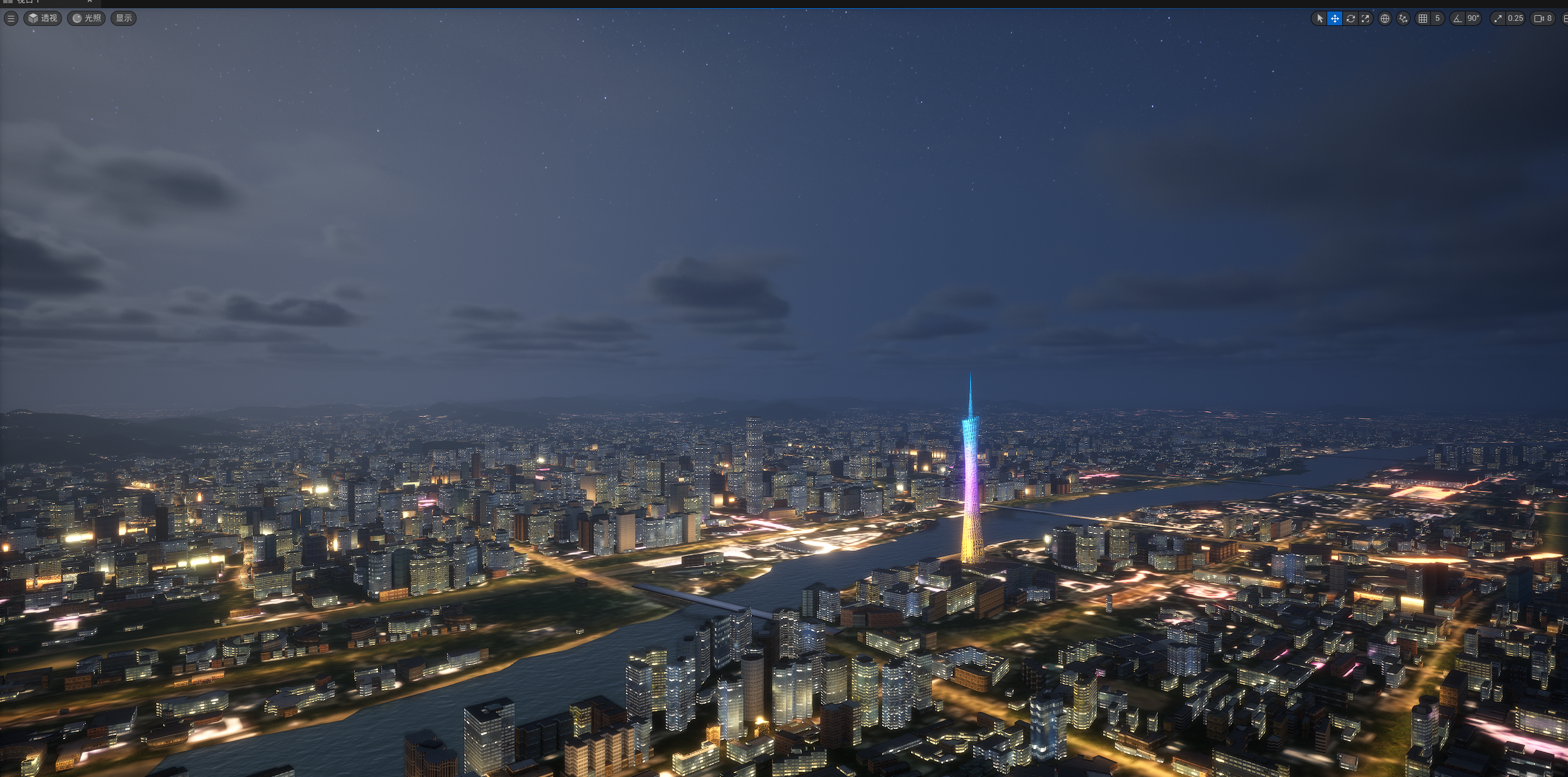 UE524小时全动态灯光实时渲染,运行畅顺,效果如截图和视频所示,所见即所得,三个关卡,白天,夜景,主关卡,主关卡运行后拖动时间滑条可以实现24小时时间变化